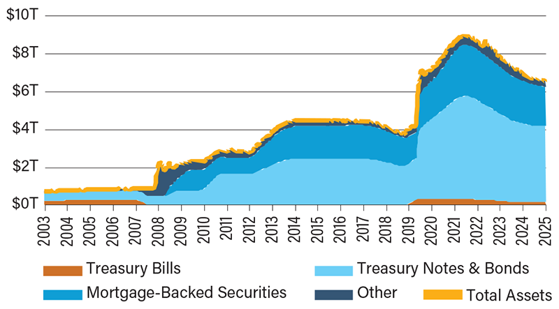 Since the Great Financial Crisis of 2008, the U.S. economy and financial markets have operated under an environment of extraordinarily accommodative monetary policy. Over time, the Fed’s balance sheet has become a central tool in sustaining that support. The Fed now uses its asset holdings to maintain a system of ample reserves—a framework in which banks hold more than enough liquidity to meet their needs without borrowing from one another, keeping short-term interest rates stable. Each time the Fed purchases securities, it credits banks’ reserve accounts, effectively creating new reserves.
