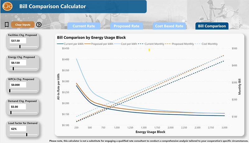 The Bill Comparison Calculator enables distribution cooperatives to compare residential members’ energy bills across different usage levels and rate structures. This new calculator can clearly demonstrate rate impacts to members, executives and directors.
