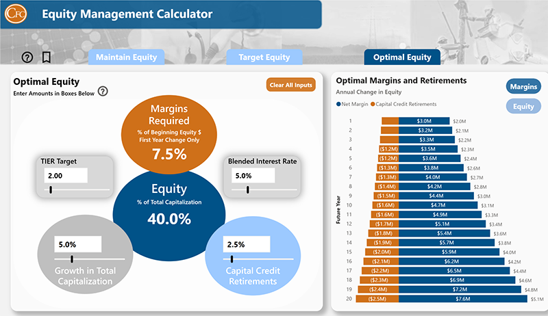 The Equity Management Calculator enables cooperatives to visualize changes in their equity position based on individual financial goals with calculations using equity as a percentage of total capitalization. This new calculator provides insights into how to align equity targets with strategic objectives.